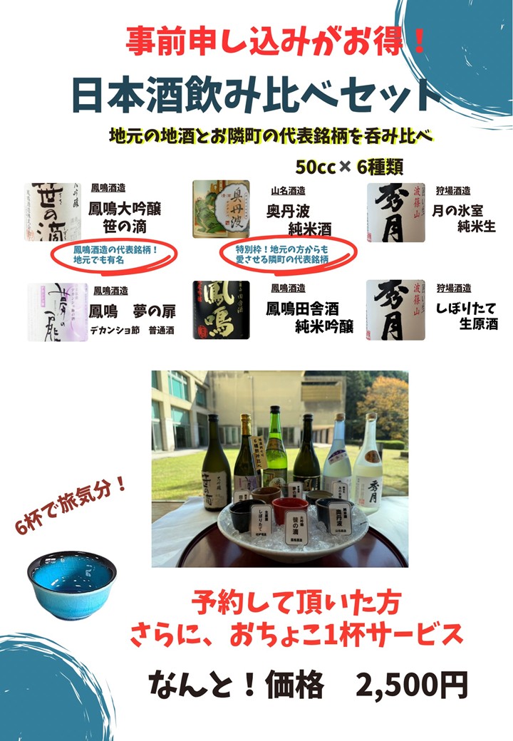 厳選された6種類の地元の日本酒を飲み比べできる特別イベント。 香りや味わいの違いを楽しみながら、日本酒の奥深さを体験してください。 この機会をお見逃しなく!